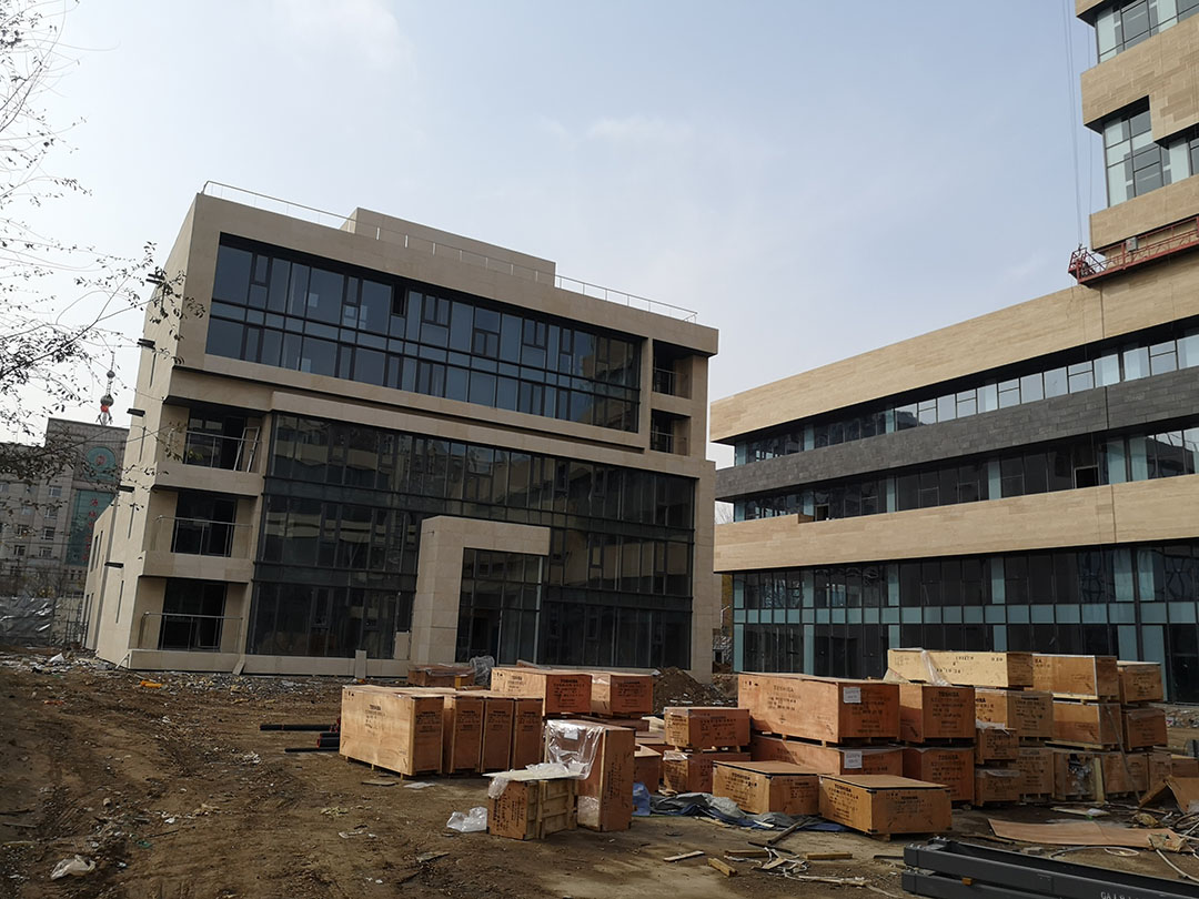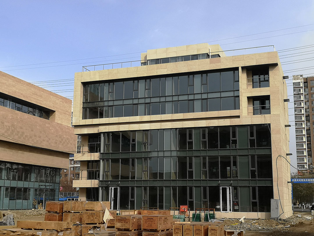 施工內容:石材幕墻、玻璃幕墻、鋁單板吊頂、玻璃欄板、點式玻璃雨棚、斷橋鋁合金平開窗、鋁合金百葉等